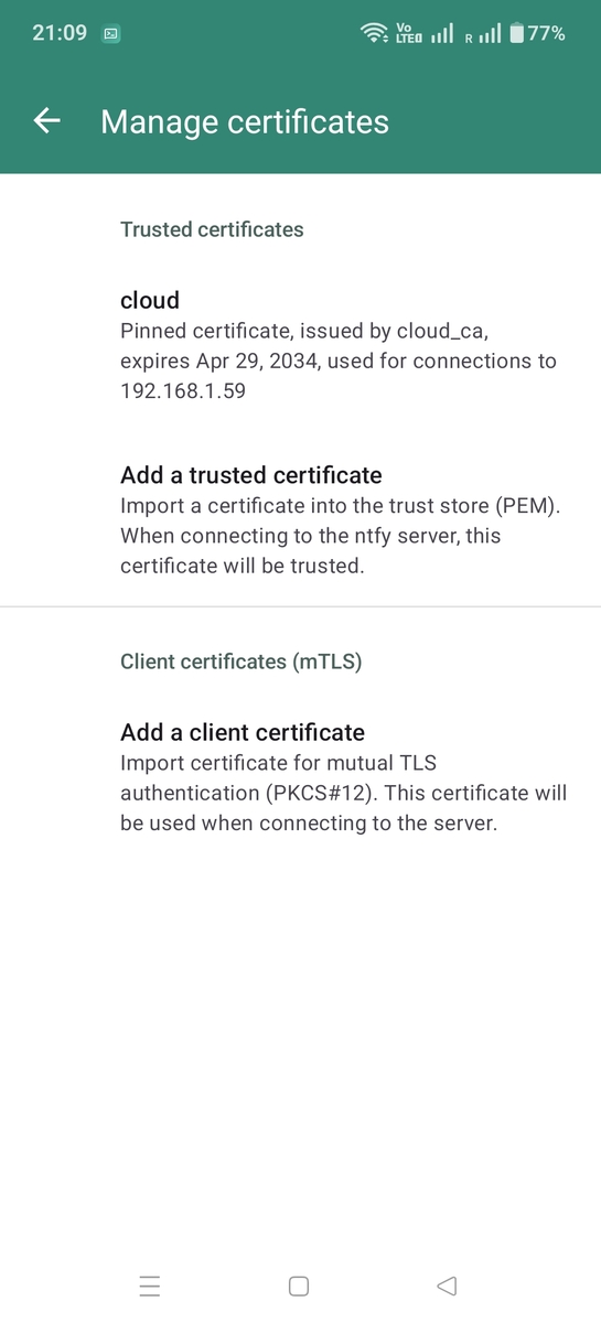 If you're running a self-hosted ntfy server with a self-signed certificate or need to use mutual TLS (mTLS) for client authentication, you can manage certificates in the app settings.