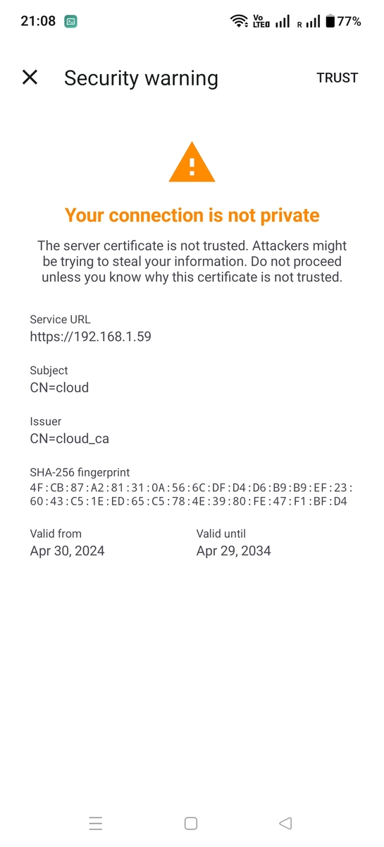 | Certificate not trusted | The server is using a self-signed certificate (see Manage certificates) |
